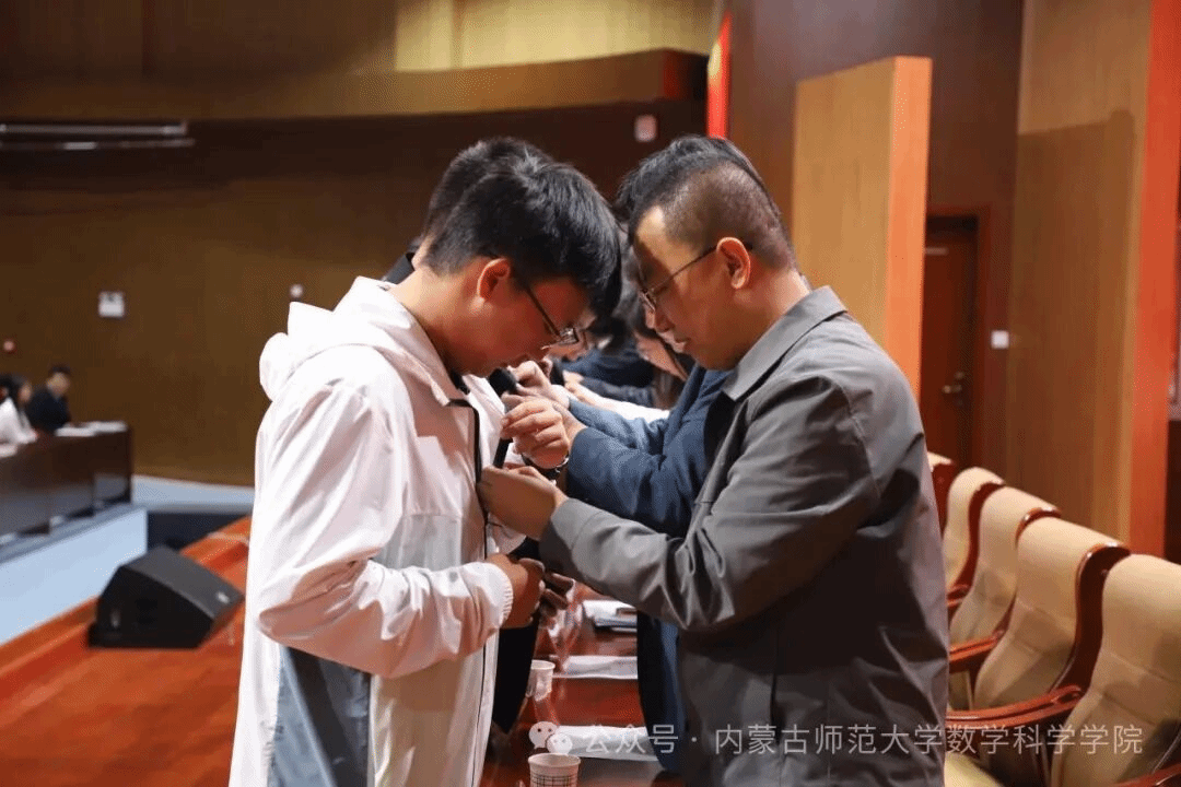在佩戴校徽环节,院领导为新生代表一一佩戴校徽。同学们仪容端正、精神抖擞,老师们的勉励寄语进一步激发了大家爱国荣校、笃学奋进的热情。