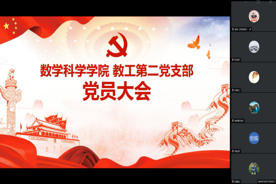 beat365官方网站beat365官方网站教工第二党支部于2024年12月30日召开党员大会,会议围绕三项重要议题展开深入讨论。会议由支部书记主持,全体党员出席,会议通过腾讯会议的形式在线上进行。