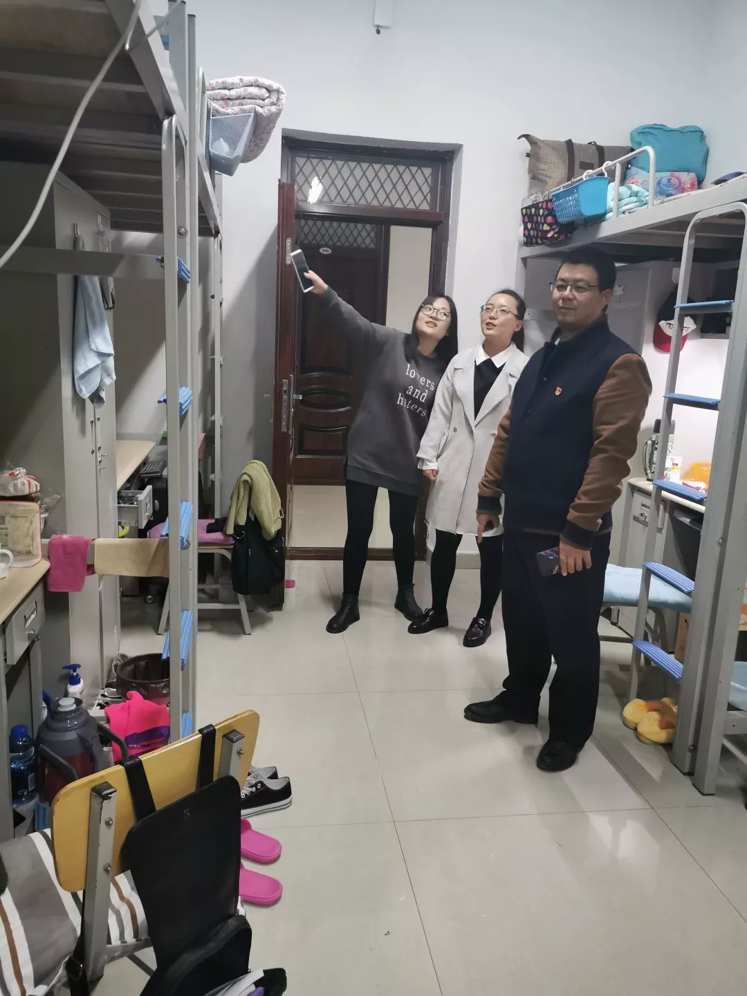 老师们提醒同学们在宿舍规范用电,切忌违章用电,禁止使用大功率电器,要及时断电,不要使手机、电脑等用电设备的充电器长期空载。
