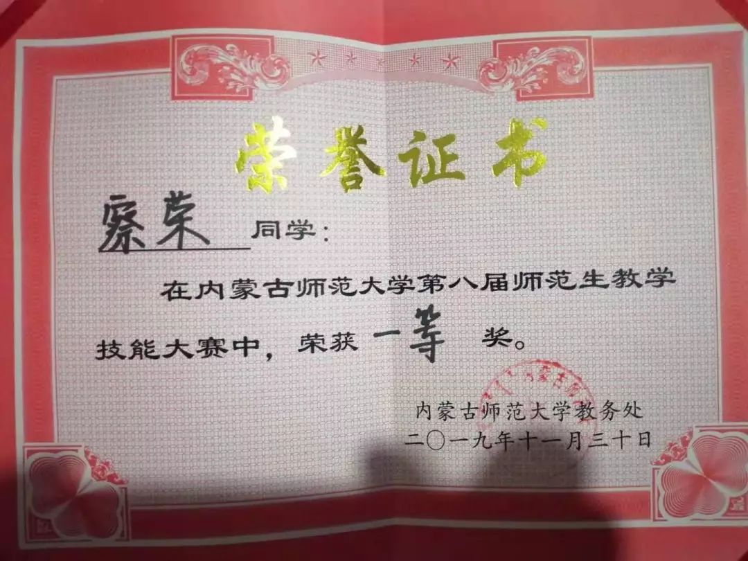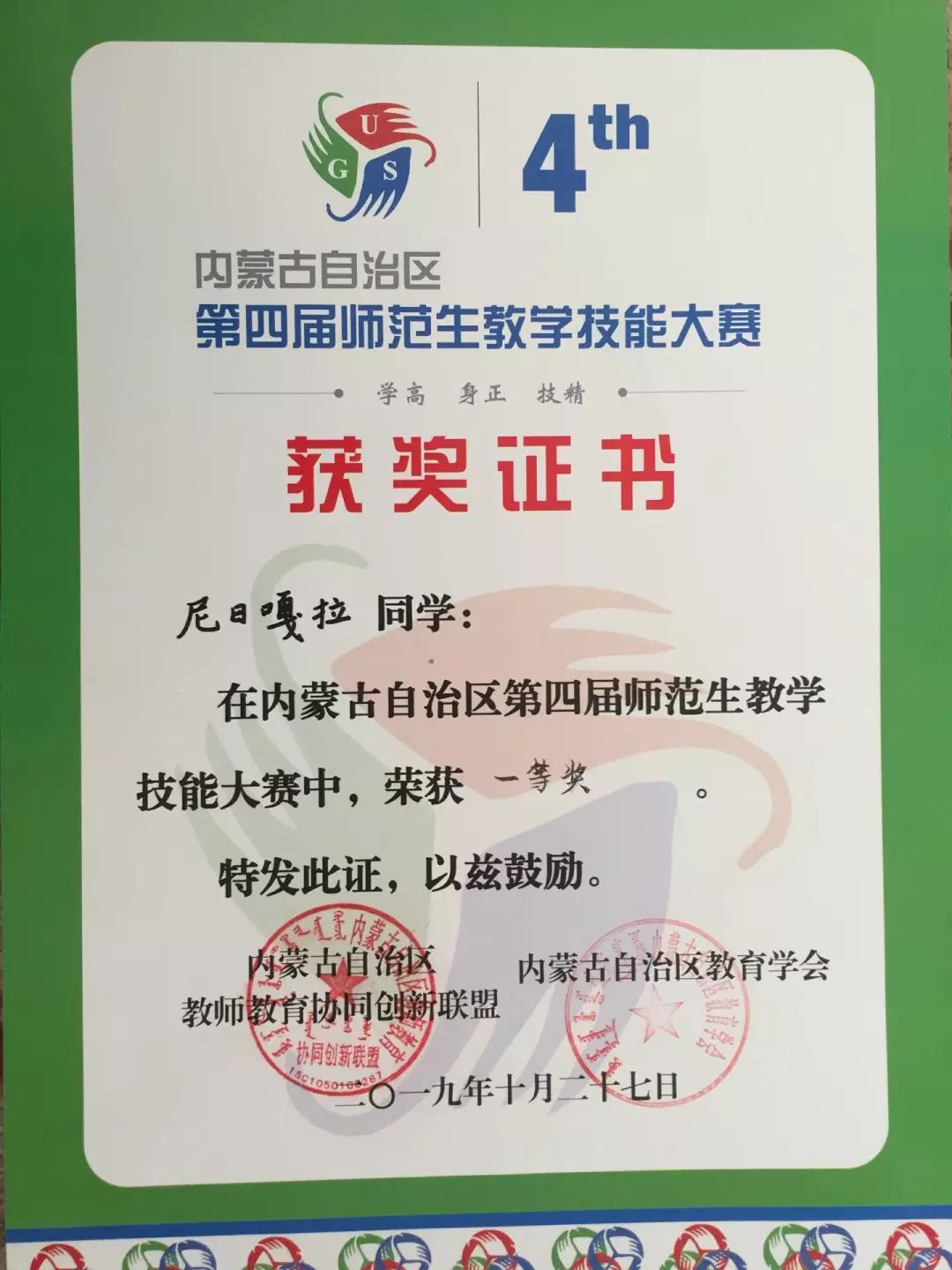 16级数学应用数学蒙班学生,2019年荣获内蒙古自治区第四届师范生教学技能大赛数学与应用数学(蒙古语)组二等奖。