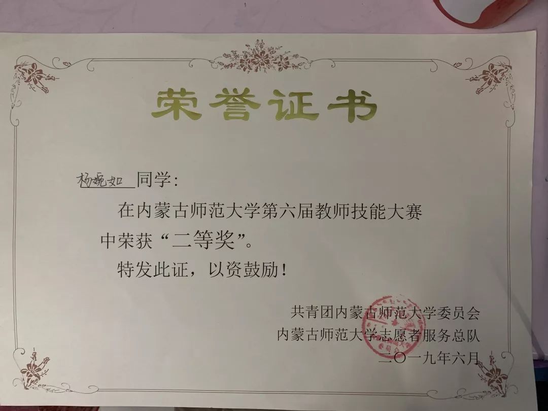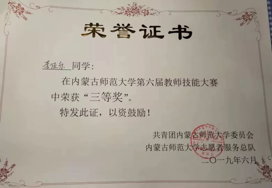 17级数学与应用数学汉二班学生,2019年荣获内蒙古自治区第四届师范生教学技能大赛数学与应用数学(汉语)组二等奖。