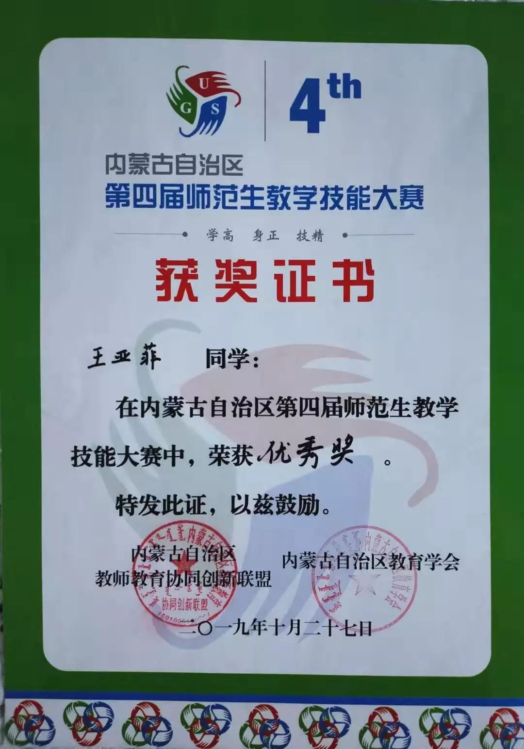 16级数学与应用数学汉班学生,2019年荣获内蒙古自治区第四届师范生教学技能大赛数学与应用数学(汉语)组优秀奖。