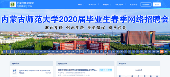 2. 2.点击右上角企业登录,初次使用需要注册(注册时用人单位名称必须与营业执照或组织机构代码证一致,已注册过我校智就业平台的单位直接登录报名参会),注册后经招生就业处审核通过后,登录即可参会。