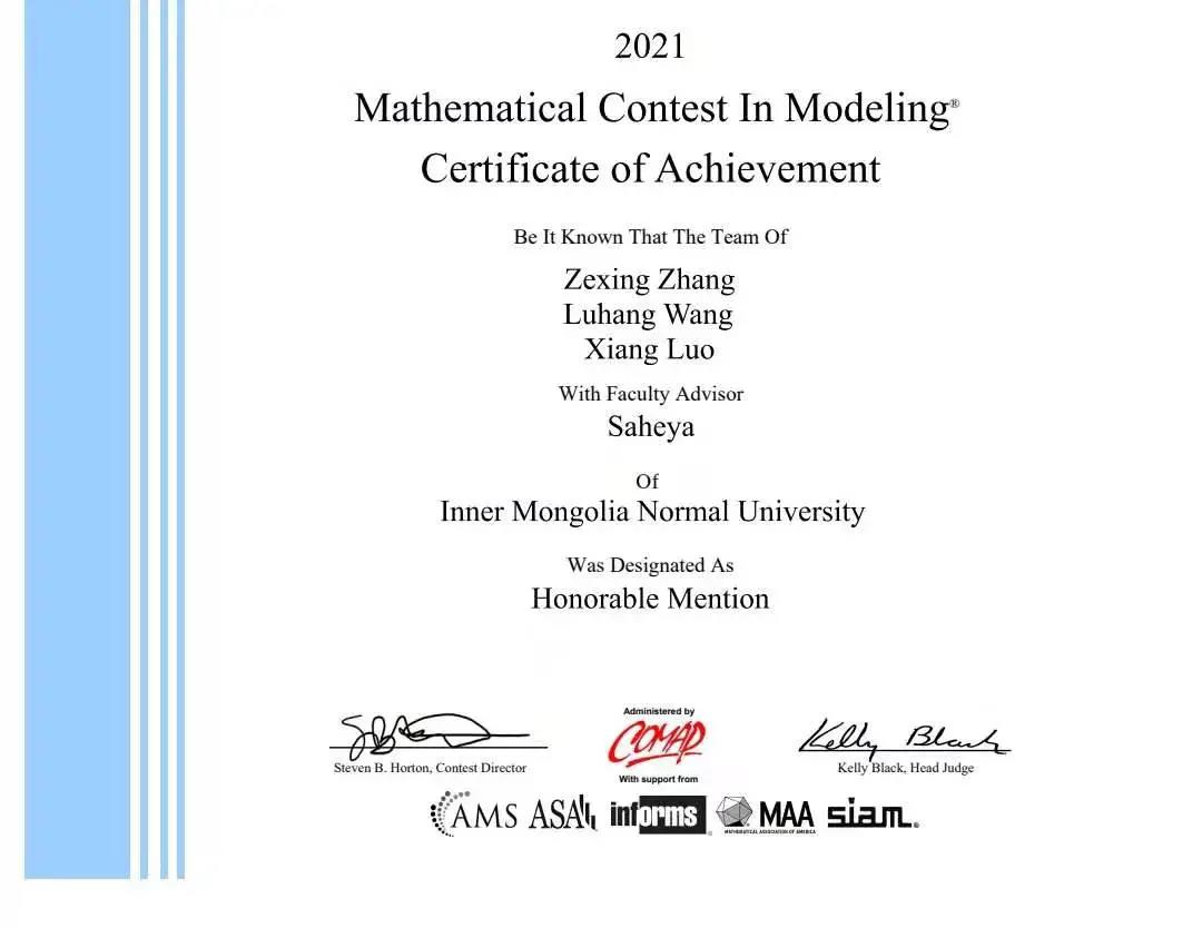 在2021美国大学生数学建模竞赛中,beat365官网王路航、罗翔、张泽兴取得二等奖!