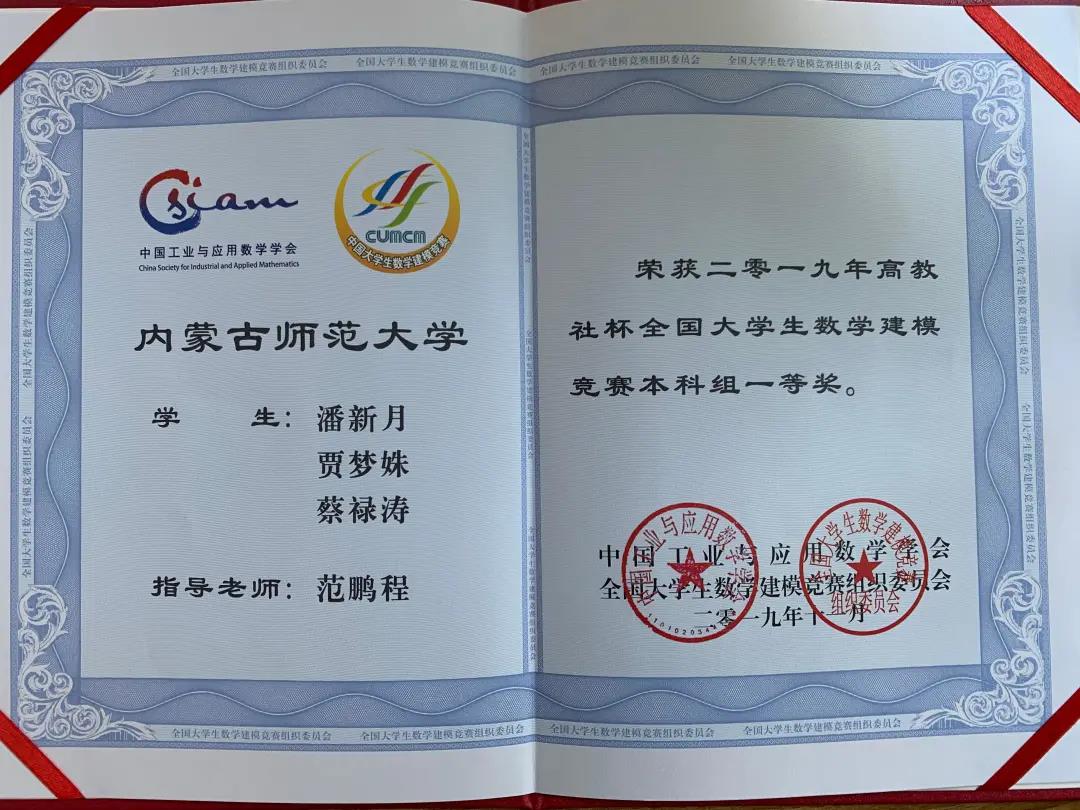 2019高教杯全国大学生数学建模竞赛,beat365官网潘新月、贾梦姝、蔡禄涛荣获一等奖!