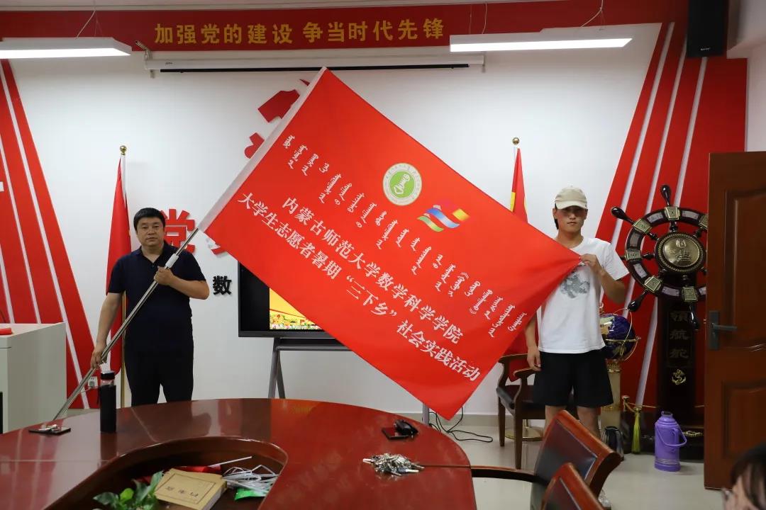 beat365官网党委副书记、副院长季建光老师为志愿者代表19级蒙班邰心同学授旗。