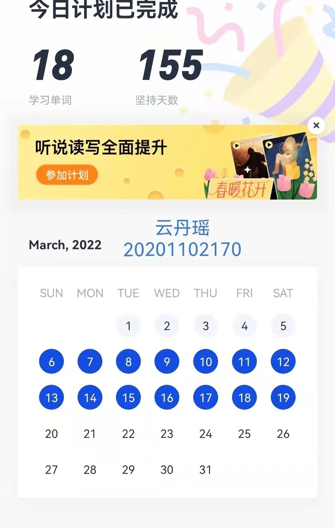 为了丰富学生的居家学习生活,提高学生的学习自觉性,beat365官方网站开展了“学习解疫,提升有我”的英语单词打卡活动,150名学生积极响应活动,进行打卡学习。
