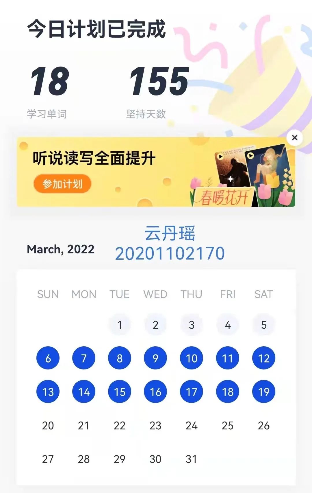 这次的单词打卡活动让同学们提高了学习的自觉性,我们更加愿意积极主动地去学习英语。打卡时候的成就感让我开心不已,我也愿意坚持下去,想看看我能走到多远。一天天的积累学习,也让我们离理想的自己更进一步。不积跬步,无以至千里。让我们一起努力吧!