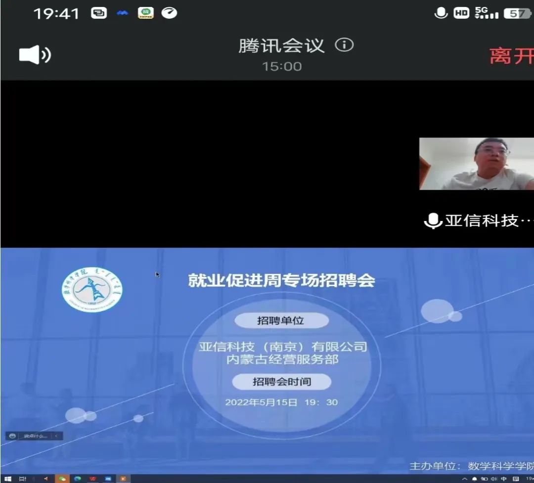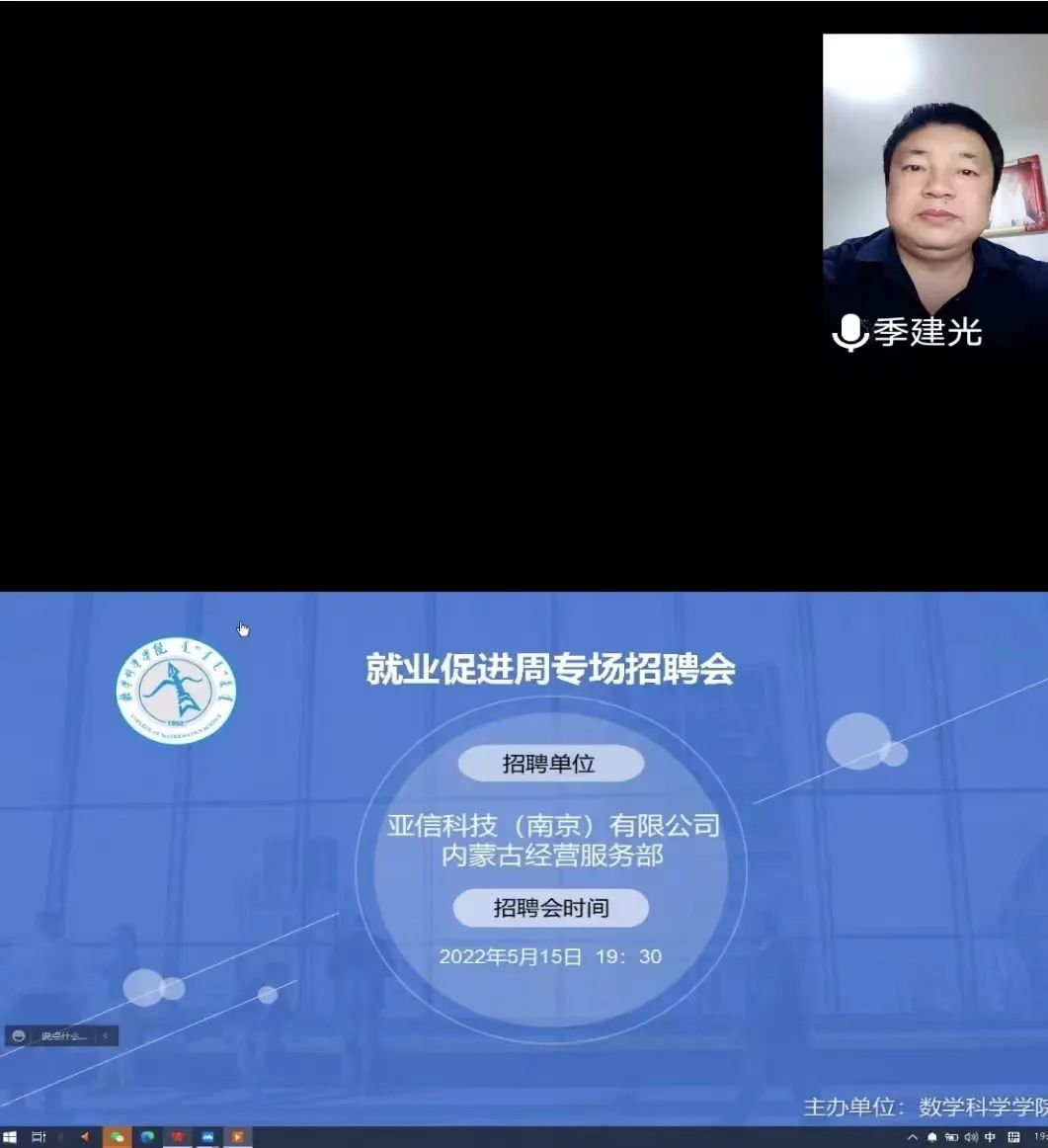 为更好的推进《beat365官方网站2022届毕业生就业促进周系列活动方案》的工作要求,全力促进毕业生尽早就业、顺利择业,5月15日晚,学院针对非师范专业毕业生,邀请亚信科技(南京)有限公司内蒙古经营服务部举办了“就业促进周”网络专场招聘会,学院党委副书记季建光、学生工作与就业办公室副主任刘沙沙、辅导员萨如拉以及亚信科技(南京)有限公司内蒙古经营服务部的负责人参加招聘会议,beat365官网2022届信息与计算科学和统计学专业的50多名毕业生参加本次招聘会。