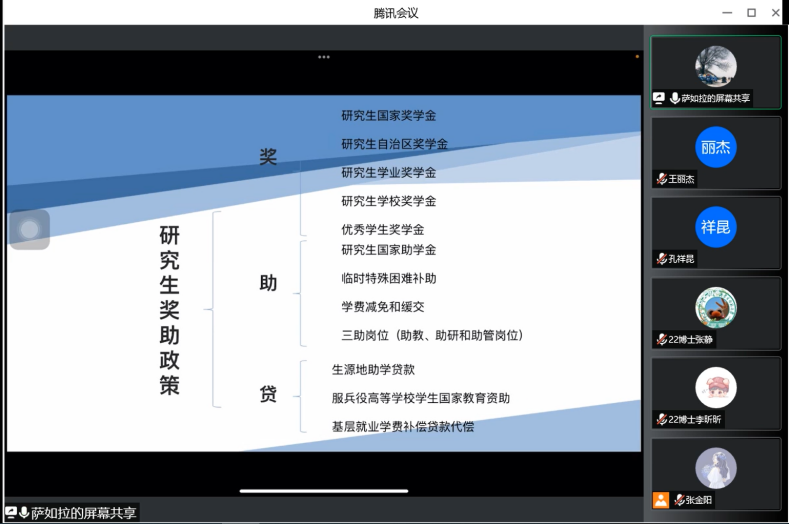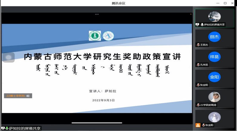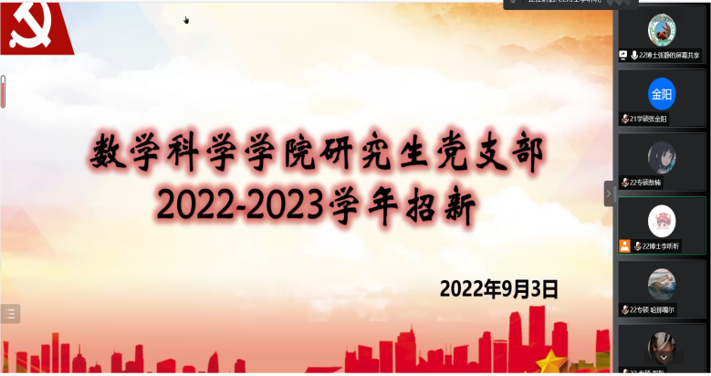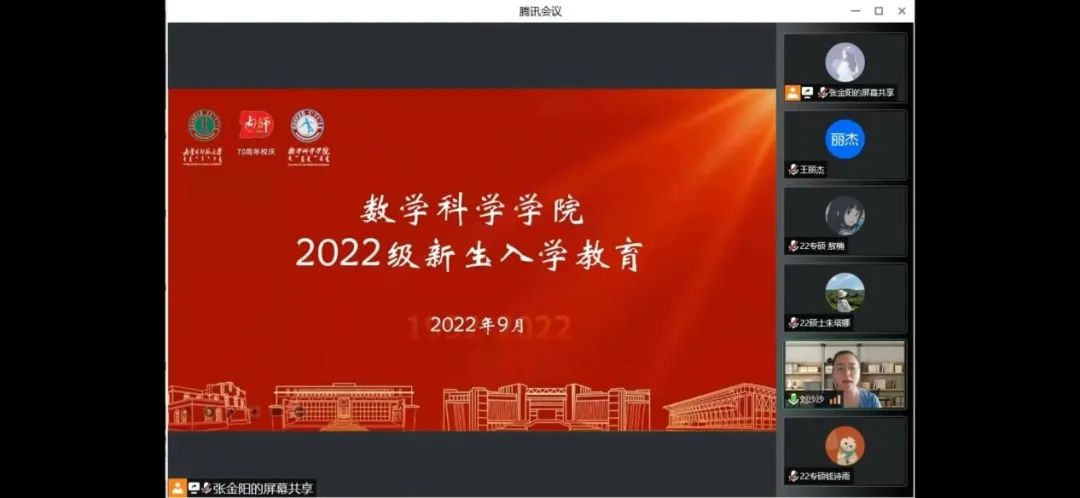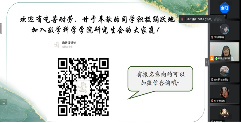 2022年9月3日晚20:30,beat365官网举办了线上新老生见面交流会,两校区全体研究生参加此次活动,活动由20级学硕李昕昕同学主持。张静同学、李颖同学、李昕昕同学分别对学院研究生党支部、研究生团支部、研究生会分别做了介绍及招新安排,同时希望同学们积极参加学生组织,在学习生活之余提升自己各方面能力。