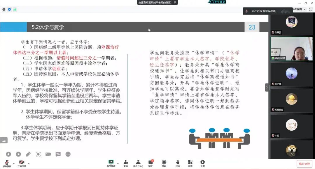 阿如罕老师为新生们开展了本科生选课指导讲座,包括学业须知、培养方案、考核与成绩记载、选课及相关操作、学业预警,及毕业要求。勉励新生在学业方面要努力学习,避免挂科;在选课方面要听从学委要求,谨慎仔细。