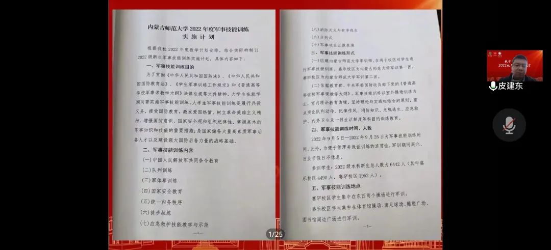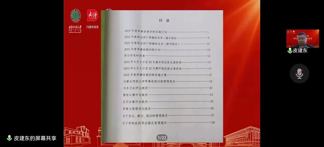 9月6日上午7:30,beat365官方网站于线上举办2022年度学生军事技能训练动员大会。学院学生思想政治工作辅导员刘沙沙老师主持此次会议,beat365官方网站党委副书记、副院长季建光老师、学院团总支书记皮建东老师参加此次会议。