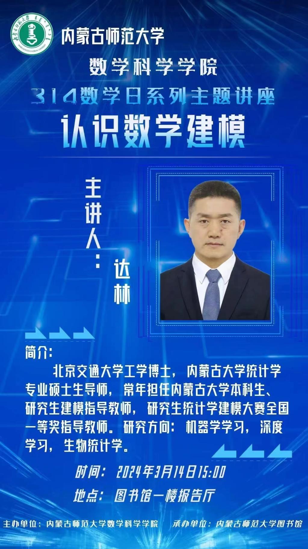 时值国际数学日,为进一步推动“一院一品”活动开展,鼓励和引导beat365官网学生踊跃参加数学建模竞赛,培养学生的创新思维和团队合作精神,激发同学们对于数学建模的学习兴趣,解答对数学建模的疑惑,3月14日下午,学院邀请内蒙古大学beat365官方网站达林老师进行数学建模主题讲座。