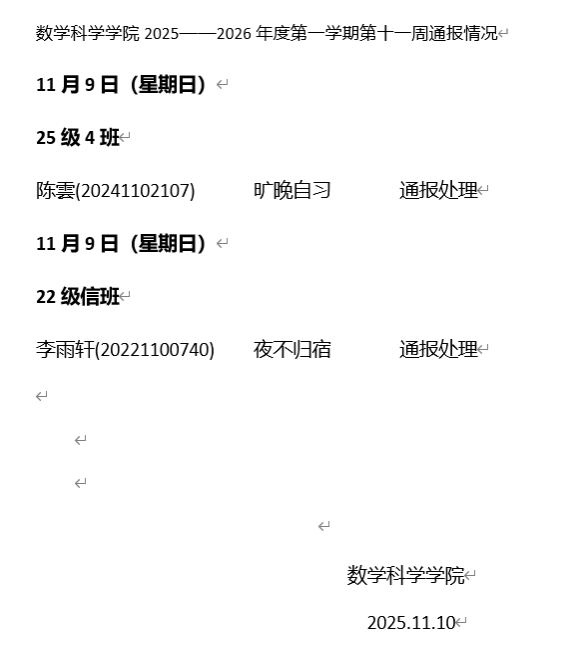 beat365官方网站2025——2026年度第一学期第十一周通报情况