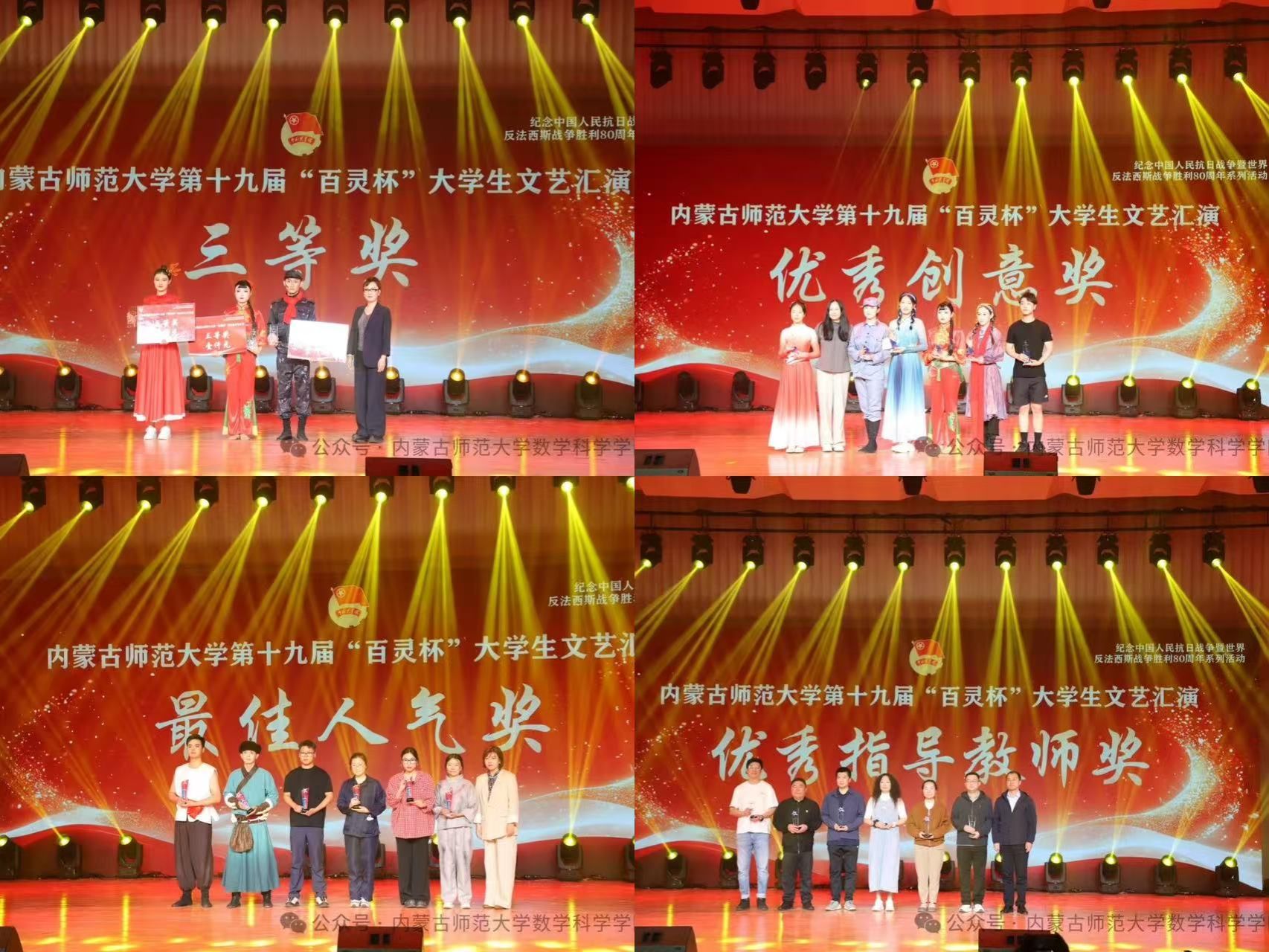 5 月 11 日,beat365官方网站纪念中国人民抗日战争暨世界反法西斯战争胜利80周年系列活动——beat365官方网站第十九届“百灵杯”大学生文艺汇演在盛乐校区音乐厅隆重举行。beat365官方网站选送的舞蹈作品《九儿》凭借精湛的表演和深刻的情感表达惊艳全场,最终斩获三等奖、最佳人气奖及优秀创意奖三项殊荣,学院的指导教师也荣获优秀指导教师奖!