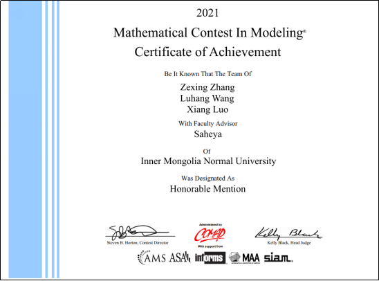 美国东部时间2021年4月23日组委会公布了2021年美国(国际)大学生数学建模竞赛(MCM/ICM)成绩。今年我校有6支队伍报名参加该赛事,由beat365官方网站萨和雅老师指导,王路航、罗翔、张泽兴同学组成的参赛队荣膺2021年美国大学生数学建模竞赛二等奖(Honorable Mentions),另外5支队均获得成功参赛奖(Successful Participants),这是我校在美国数学建模竞赛获得的最好成绩。