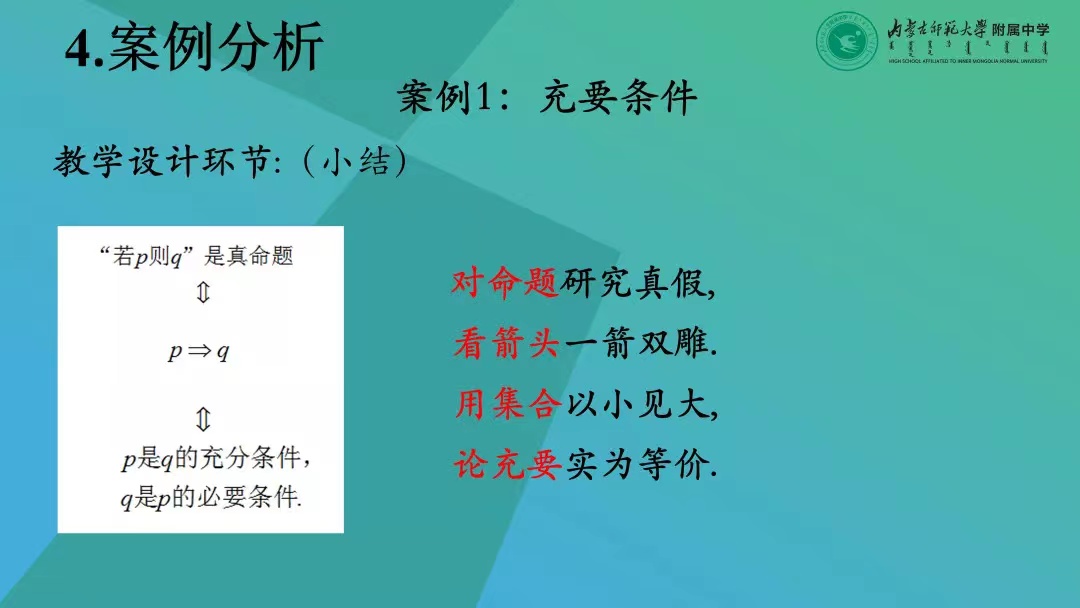 在给出如何备课的理论基础后,张生老师以《充要条件》和《两角和与差的正切公式》这两个真实案例向我们具体的展示了他是如何“用艺术的眼光备课”的。张生老师备课思路灵活又严谨,不乏趣味性,完美地体现了“用教材教”而不是“教教材”,每每到课堂的最后,总以精美的数学诗句、押韵的语句等提炼整节课的核心知识方法与思想,他的课如一个个艺术品一样,赏心悦目的同时,又能让学生满载而归。