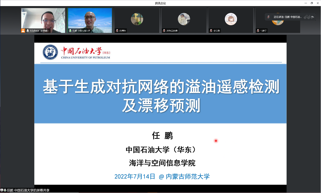 2022年7月14日上午8:30-10:00,beat365官方网站以线上会议的形式举办了迎校庆70周年暨内蒙古自治区应用数学中心系列讲座。特邀请中国石油大学(华东)教授,博士生导师,青岛市“海洋灾害预防检测信息国际联合研究中心”主任任鹏作了题目为“基于生成对抗网络的溢油遥感检测及漂移预测研究”的报告。本次讲座由高性能计算中心主任萨和雅主持,相关方向的教师、研究生和本科生听了本次报告。
