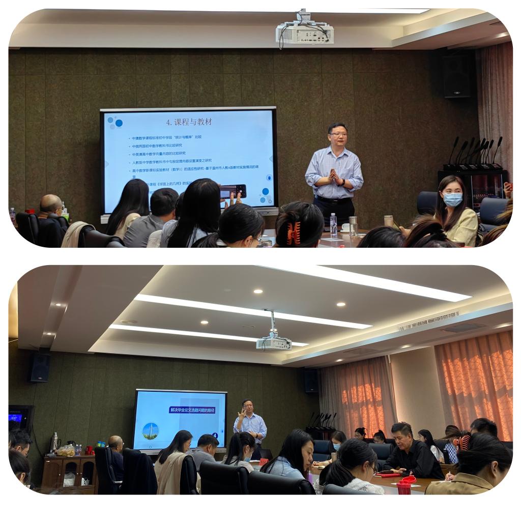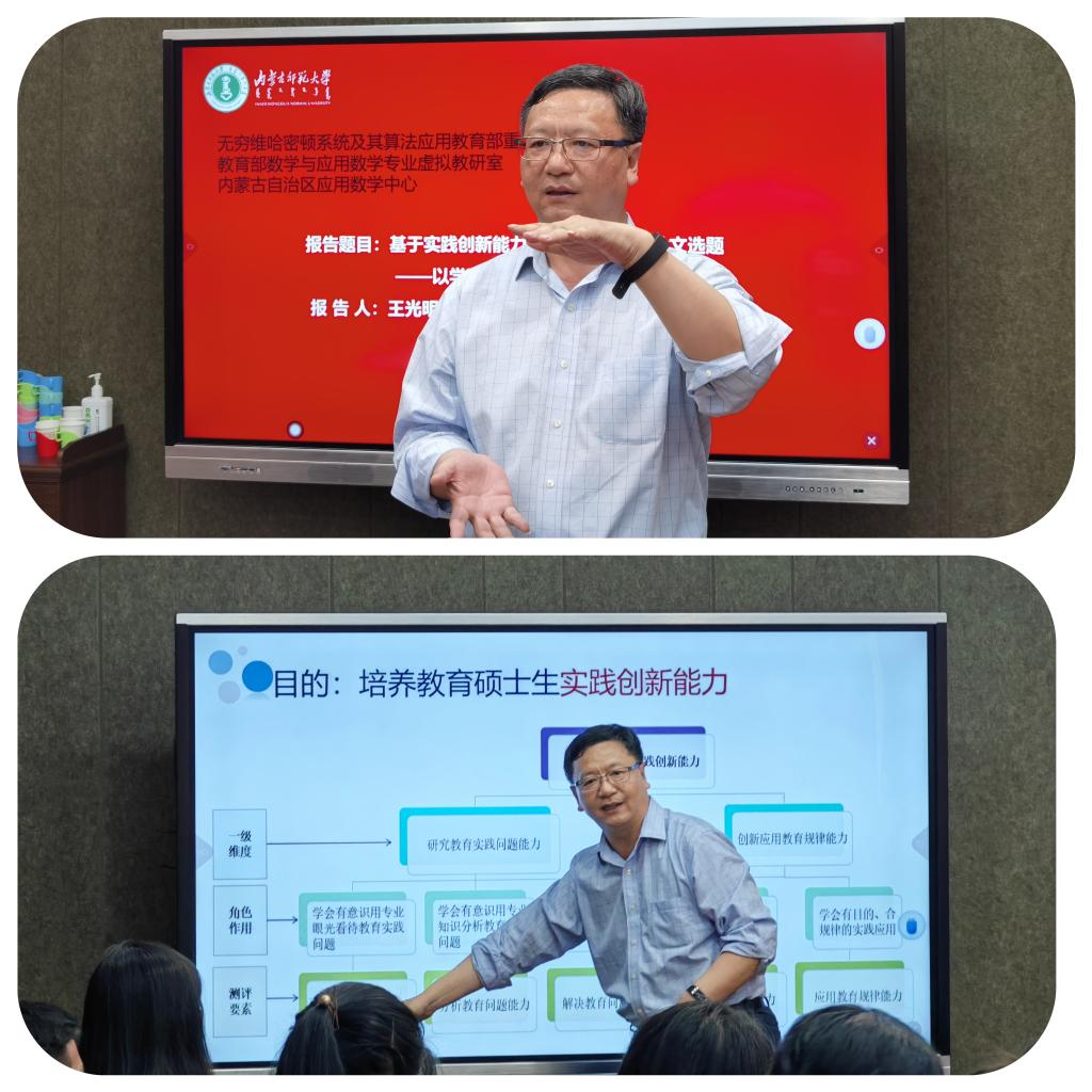 5月3日下午,beat365官网举办教师教育名家系列学术讲座,邀请到国务院学位委员会全国教育专业教育指导委员会委员、教育部高等学校(教育学类)专业教学指导委员会委员、教育部高等学校中学教师培养教学指导委员会委员、教育部普通高等学校师范类专业认证专家委员会学术委员会委员、教育部基础教育教学指导委员会数学专委会委员、《数学教育学报》和《中等数学》主编、天津师范大学教育学部部长、博士生导师王光明教授作了题为“基于实践创新能力的教育硕士学位论文选题—以学科教学(数学)为例”的学术讲座。讲座由beat365官网李春兰教授主持。相关专业的教师、研究生和本科生聆听了讲座。