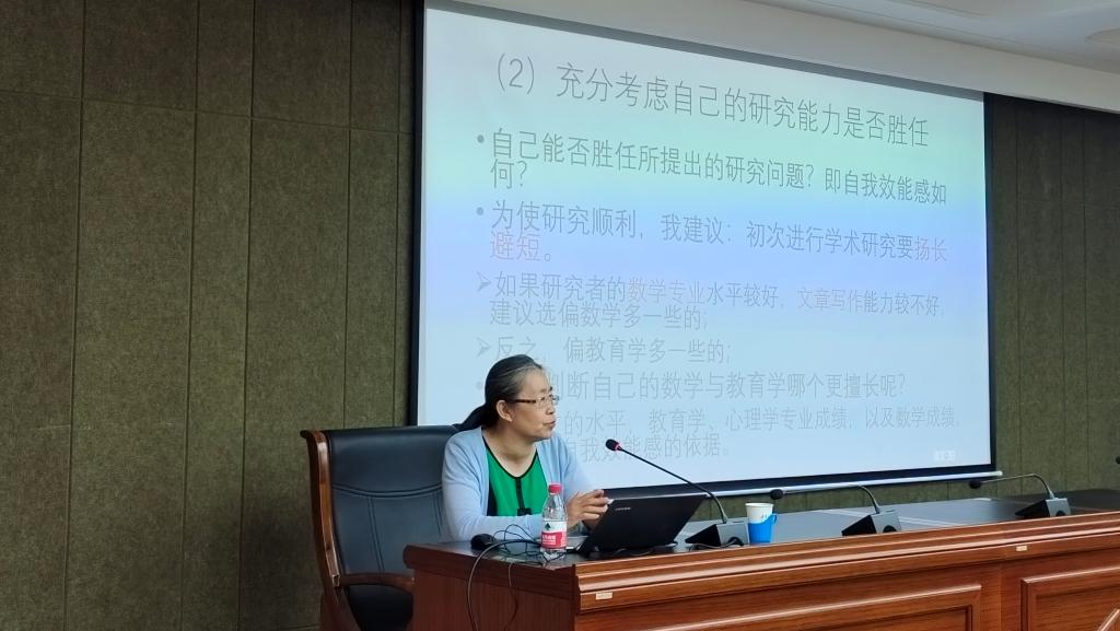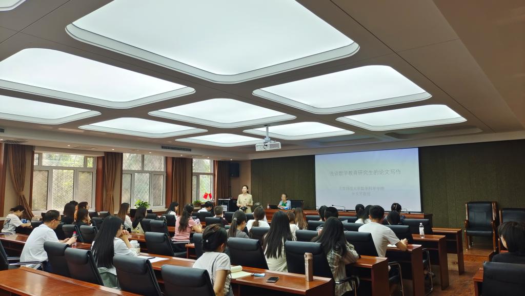 6月18日,beat365官网特邀中国教育学会中学数学教学专业委员会副理事长、学术委员会副主任、北京师范大学博士生导师朱文芳教授作了题为“浅谈数学教育研究生的论文写作”的学术讲座。讲座由beat365官网李春兰教授主持,参加本次讲座的主要有beat365官网领导、老师、数学教育方向的硕士研究生、硕士研究生实践导师、其他学院的师生。