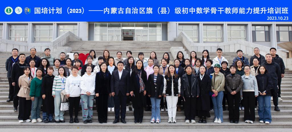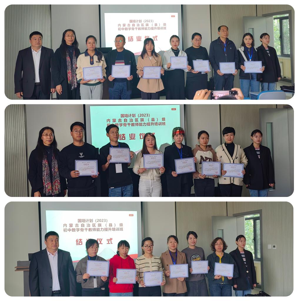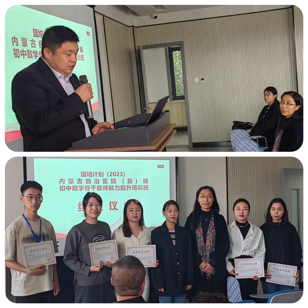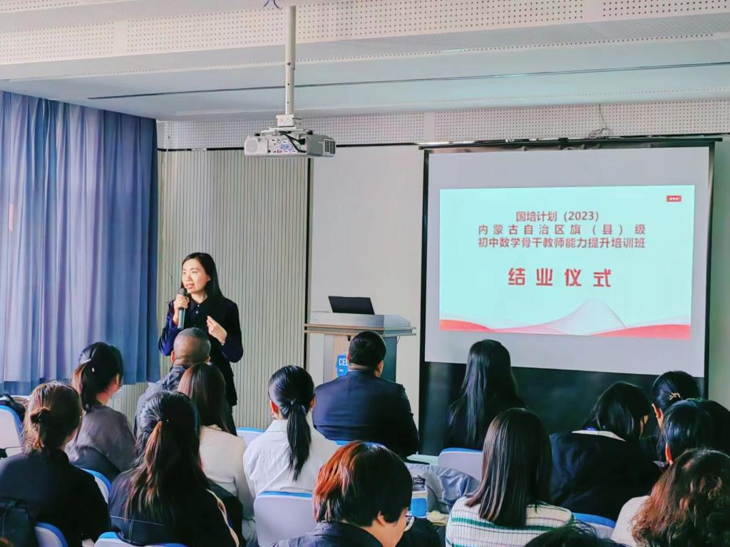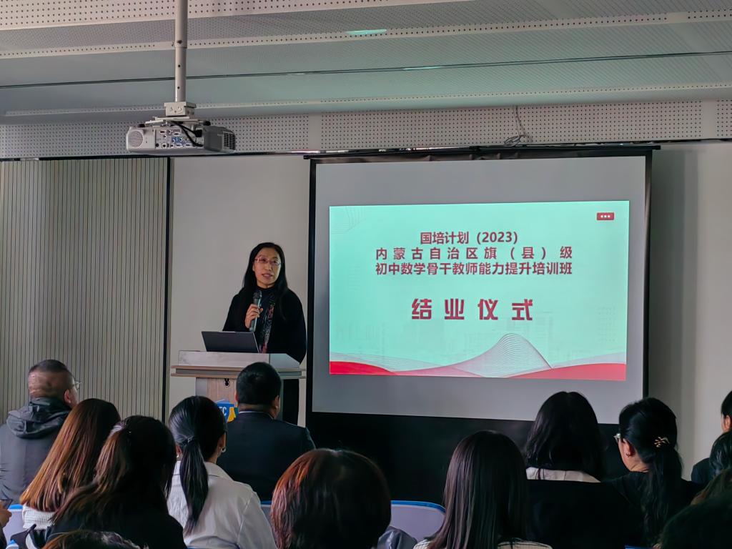 10 月 23 日下午 “国培计划(2023)——内蒙古自治区旗(县)级初中数学骨干教师能力提升”培训在beat365官方网站圆满落幕。本次培训由beat365官方网站继续教育学院主办,beat365官方网站承办,为期14天,含集中研修7天和跟岗实践7天,50名学员来自全区各盟市选派来的旗(县)级初中数学骨干教师。继续教育学院培训部薛佳琦老师、beat365官方网站副书记季建光老师、培训项目负责人数学科学院副院长包霞老师、培训项目对接人数学科学院李春兰老师、培训班班主任及相关工作人员出席了结业典礼。李春兰老师主持了结业仪式。