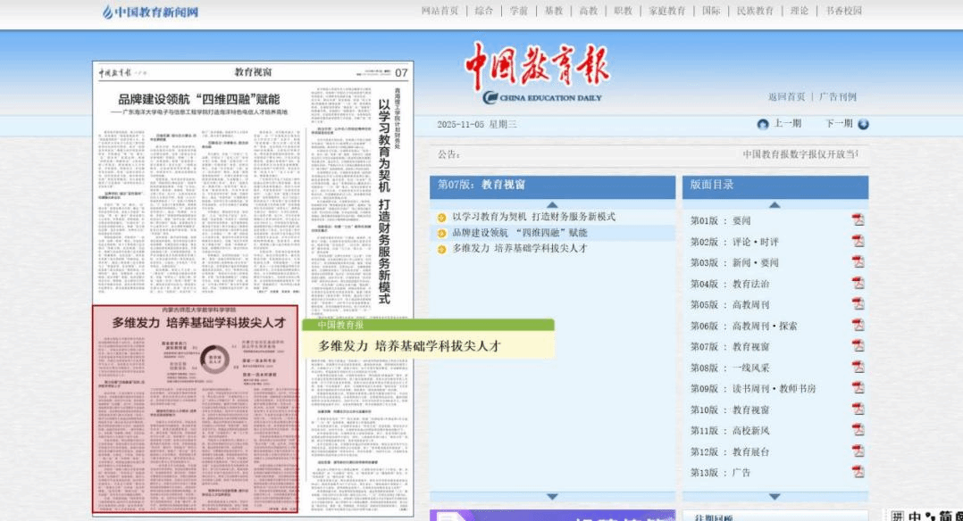 《中国教育报》2025年11月5日第07版教育视窗,以”多维发力 培养基础学科拔尖人才“为题报道beat365官方网站beat365官方网站基础学科拔尖人才培养工作成效。全文链接:http://paper.jyb.cn/zgjyb/h5/html5/2025-11/05/node_1.htm?v=1&curr=6