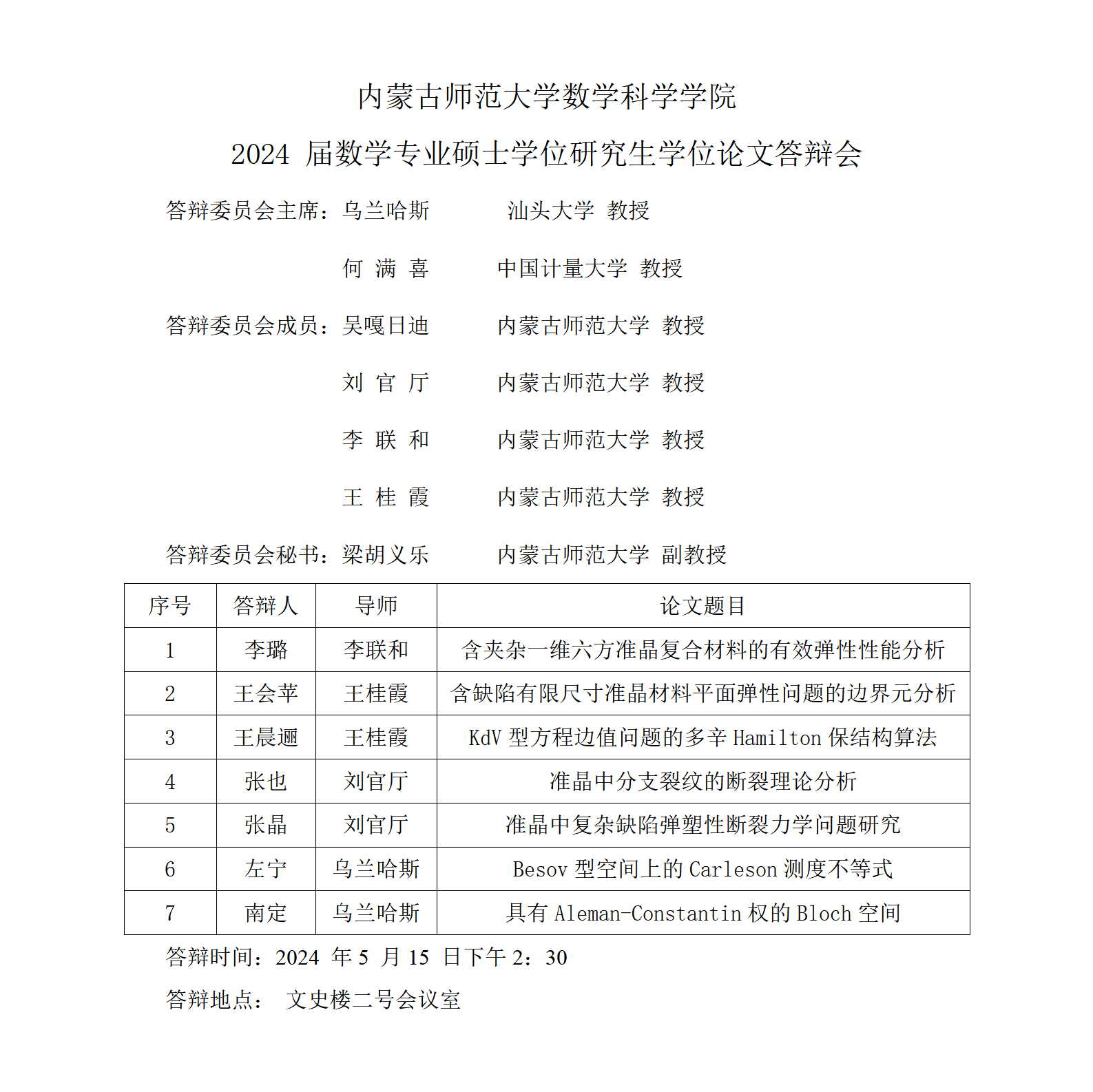 2024届数学专业硕士学位论文答辩会(一)