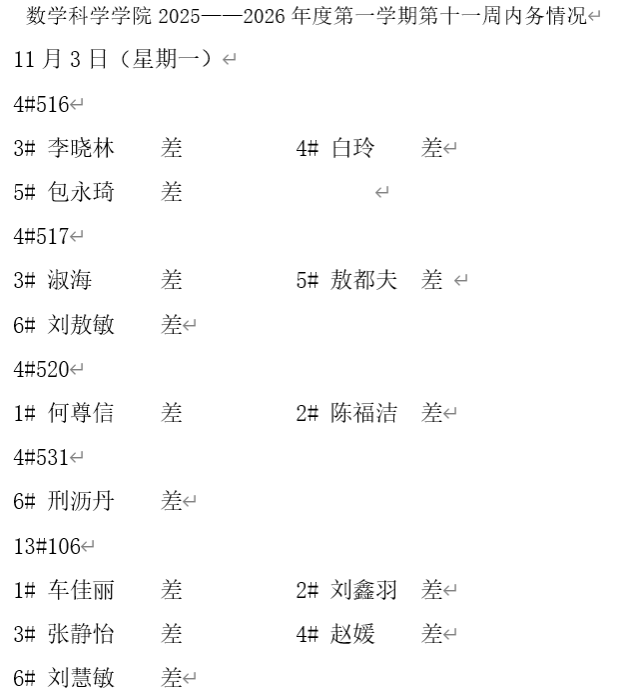 beat365官方网站2025——2026年度第一学期第十一周内务情况